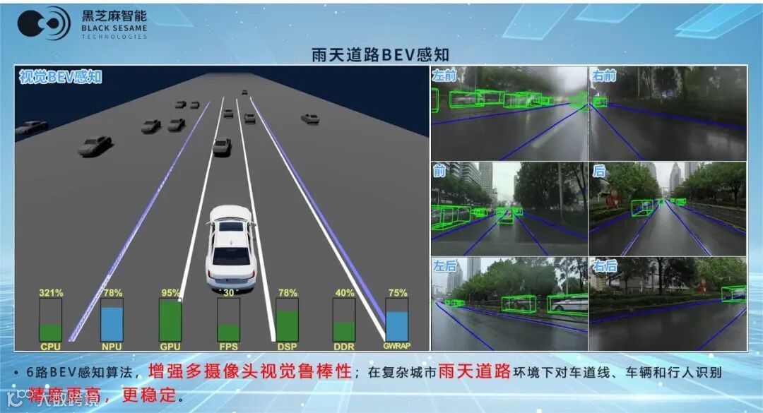 与吉咖、百度、易行、泰为和保隆等重点生态合作伙伴的方案也将以实车视频完整展示,其中包括基于黑芝麻智能芯片NOA高速领航系统、基于华山二号A1000芯片的ICA和PLC系统、基于华山二号A1000芯片的量产级BEV算法感知算法、基于华山二号A1000芯片的自动泊车、魔毯功能等。