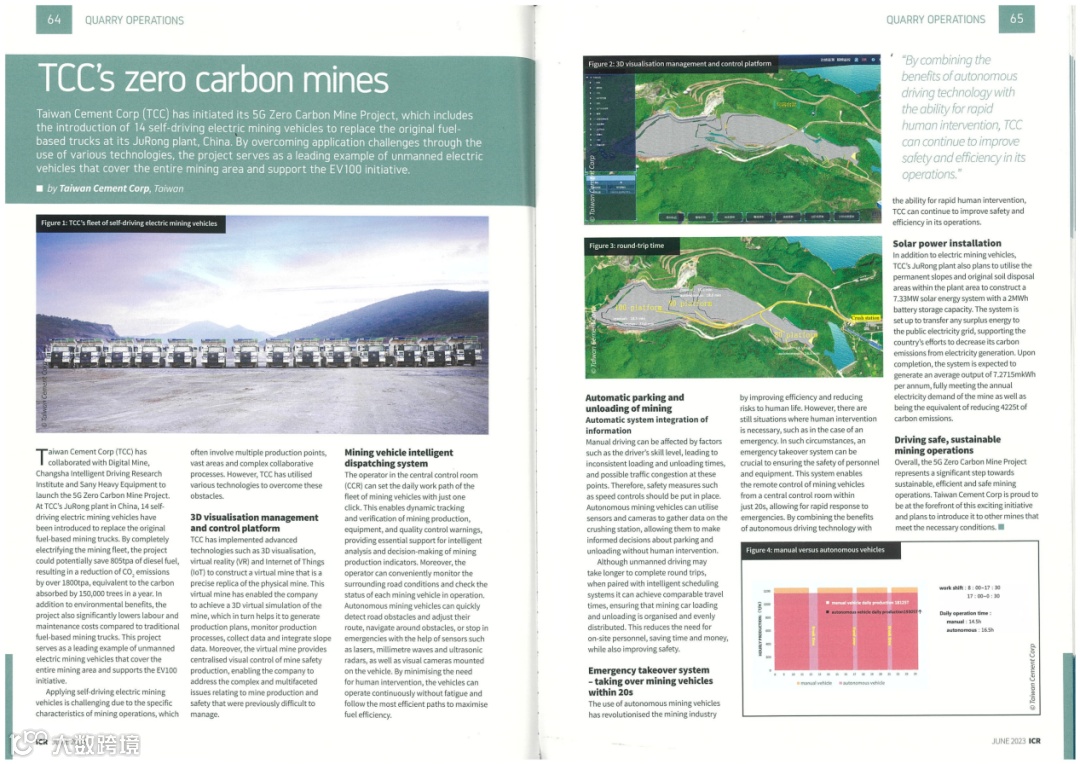 Taiwan Cement Corp (TCC) has collaborated with Digital Mine, Changsha Intelligent Driving Research Institute and Sany Heavy Equipment to launch the 5G Zero Carbon Mine Project. At TCC's JuRong plant in China, 14 self-driving electric mining vehicles have been introduced to replace the original fuel-based mining trucks. By completely electrifying the mining fleet, the project could potentially save 805tpa of diesel fuel, resulting in a reduction of CO₂, emissions by over 1800tpa, equivalent to the carbon absorbed by 150,000 trees in a year. Ln addition to environmental benefits, the project also significantly lowers labour and maintenance costs compared to traditional fuel-based mining trucks. This project serves as a leading example of unmanned electric mining vehicles that cover the entire mining area and supports the EV100 initiative.