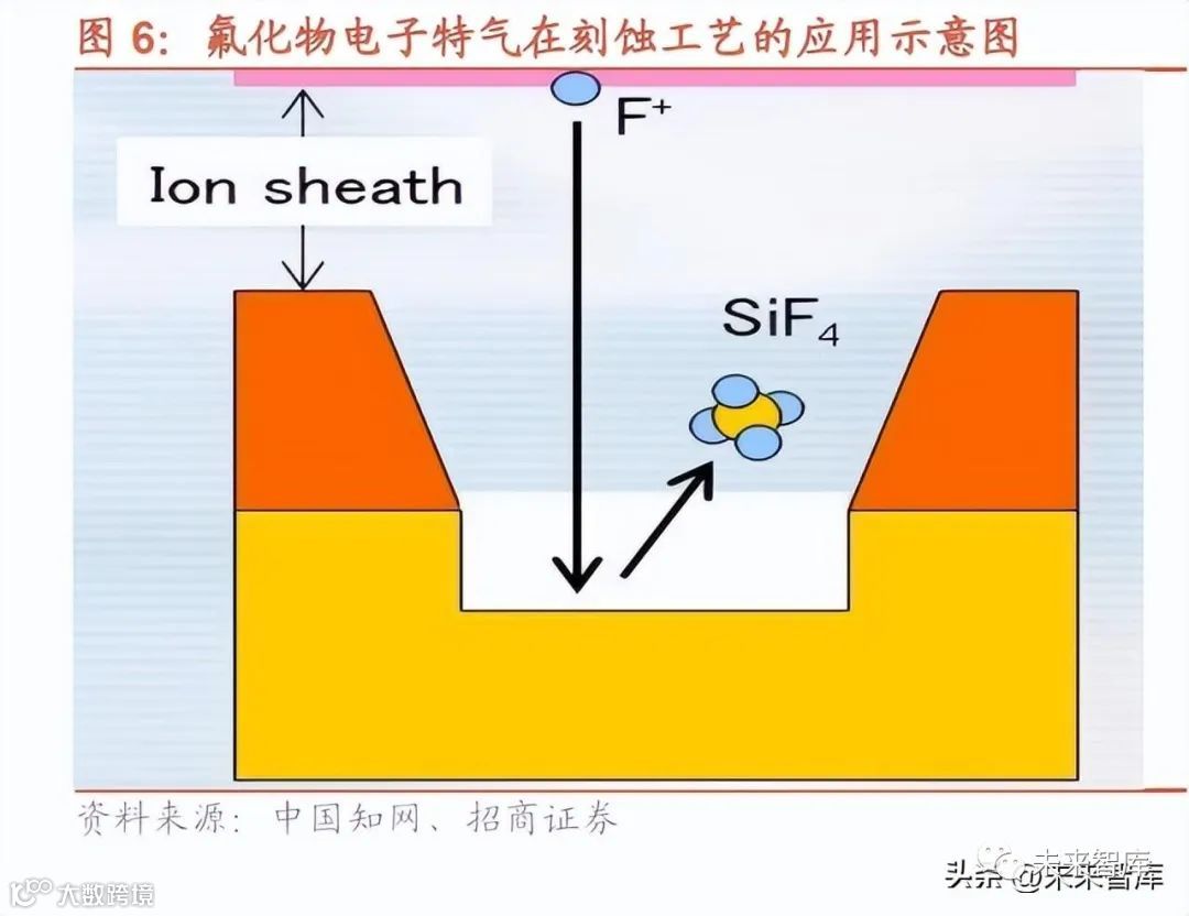 在晶圆制造的沉积成膜工艺流程中:首先使用氟化铵和氟化氢等多元电子特气吹扫刻蚀晶圆基板,以获得平整规则的 晶圆表面;然后使用铪烷/氧/氩混合电子特种气进行沉积吹扫,在晶圆表面上形成一层氧化铪膜;最后使用硅烷/氧/ 氩混合气进行沉积吹扫,继续在氧化铪膜的表面上形成一层氧化硅膜。氟化物电子特气刻蚀晶圆基材的化学原理为:氟离子具有强酸性,可以与硅片发生化学反应,腐蚀掉晶圆表面的硅膜。在晶圆上“雕刻”电路图,是通过光刻工艺实 现的,需要依次经过:沉积成膜→光阻成膜→显影→光刻刻蚀→光阻去除等五个步骤,反复进行以上步骤,就可以将 光罩上的电路图转移到晶圆上,实现集成电路的设计制造,以上步骤中均需要不同种类的电子特气参与。