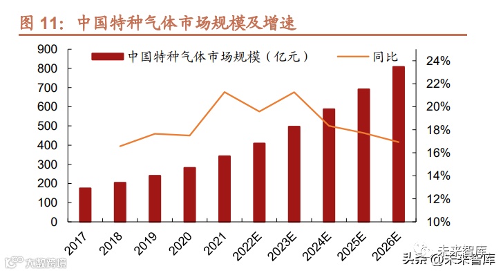 中国特种气体市场规模 CAGR 高达 18%,预计 2026 年将超 800 亿元。近年来,中国特种气体市场规模快速增长, 从 2017 年的 175 亿元增长至 2021 年的 342 亿元,CAGR 高达 18%。根据亿渡数据,预计到 2026 年中国特种气体 行业的市场规模将增长到 808 亿元,CAGR 为 18.76%。