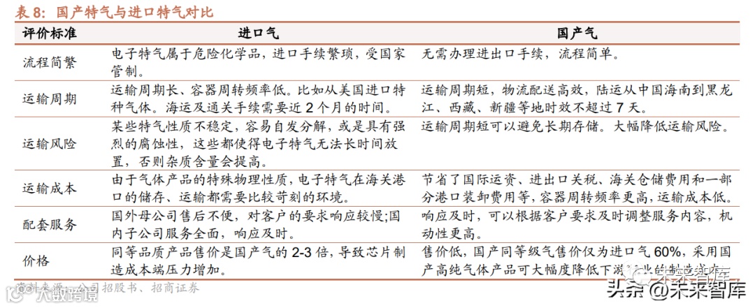 相较于进口气,国产气具有多项优势,国产替代是未来趋势。和进口气相比,国产气具有流程简单、运输周期短、运 输风险较低、容器周转频率更高、运输成本低、机动性更高、售价较低的优势,因此国产替代将是未来发展趋势。从 运输成本看,电子特种气体属于危险化学品,在产品包装和运输方面都有严格的规定,国外进口的特种气受国家管制, 进出口周期长,运输成本极高,容器周转频率低,而国产特气物流快捷、成本低。从产品价格看,外源进口特气的运 输成本基本都折算在高昂的销售价格上,国产电子特气相对于进口特气具有明显价格优势,提高国产化替代率将大幅 度降低下游行业的制造成本。