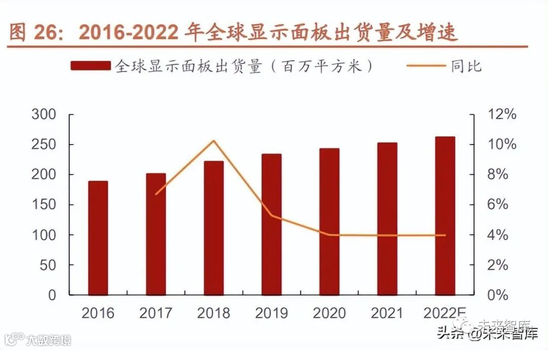 我国是全球主要显示面板生产地和消费地,随着面板市场扩容,将带动电子特气需求持续提升。显示面板在全球电子 特气下游需求中占比约 19%,电子特气主要用于显示面板制造过程中前段阵列工序的成膜与刻蚀工艺,涉及硅烷、氟 化物、稀有气体和氨气等产品。近年来全面面板产业向中国转移,目前我国已经成为全球显示面板领域最大的产业基 地。2016-2022 年,全球显示面板出货量的复合年均增速为 6.53%,中国大陆显示面板出货量 CAGR 为 15.88%,中 国大陆显示面板出货量增速远高于全球水平。预计随着显示面板市场扩容和产能提升,将带动电子特气需求持续增长。