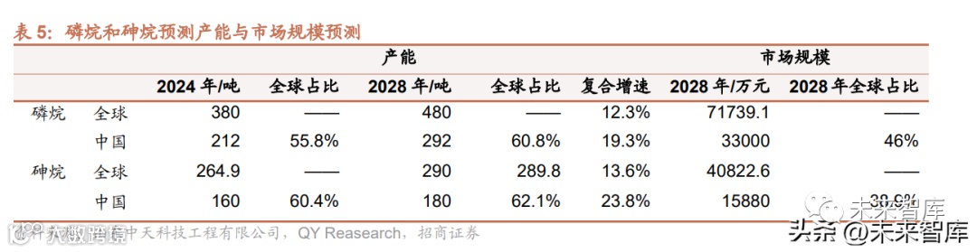 国产电子特气在部分细分产品领域内具有竞争优势,打破了国外技术的垄断。经过近十年的发展,我国电子特气企业 持续更新工艺设备和探索生产技术,在产品研发上陆续取得了重大突破,部分产品的容器处理技术、气体提纯技术、 气体充装技术和检测技术已经达到了国际通行标准,已在部分特气产品打破国外垄断,实现国产替代,例如金宏气体 的超纯氨纯度,高纯氧化亚氮,高纯氢和高纯氮等产品;华特气体的高纯六氟乙烷、高纯四氟化碳、高纯二氧化碳等 产品,河南硅烷科技公司的硅烷混合气产品,南大光电的磷烷砷烷等各种电子特种气体,品质已和外资气体巨头处于 同一水平,成为国内电子半导体领域众多知名客户的气体供应商。从电子特气行业内的细分产品来看,磷烷和砷烷是晶圆加工制造工艺中用于化学气相沉积和掺杂过程的关键材料,国 内产能在全球占比相对较高。根据 QY Research 数据,预计 2028 年时我国高纯磷烷的产能预计将提升至 292 吨, 全球占比 60.8%,2022-2028 年平均增长率将达到 19.2%,届时我国高纯磷烷市场销售规模将达到 3.3 亿元,全球占 比达到 46%;预计 2028 年时我国高纯砷烷的产能预计将提升至 180 吨,全球占比 62.1%,2022-2028 年平均增长 率将达到 23.8%,届时我国的高纯砷烷市场销售规模将达到 1.59 亿元,全球占比达到 38.9%,我国已成为全球高纯 磷烷和砷烷特种气体的主要销售地区。