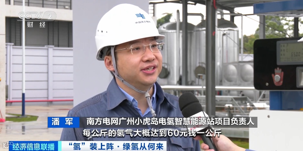 南方电网广州小虎岛电氢智慧能源站项目负责人 潘军:广州市目前的加氢站每公斤氢气大概达到60元一公斤,折算成电价大概是1.2元每度电,如果通过这种模式,绿电到绿氢,它的经济性就很好了。