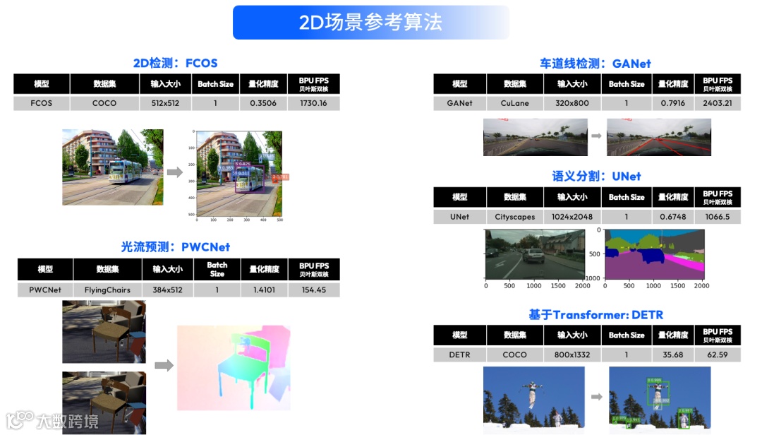 地平线参考算法开放提供面向多种感知任务的2D场景模型,例如征程3、征程5芯片均可支持基于anchor-free实现的2D检测模型FCOS,同时开放提供包括U-Net、DeepLab等极具代表性的语义分割模型,以及GANet车道线检测、PWCNet光流预测等多类示例模型。