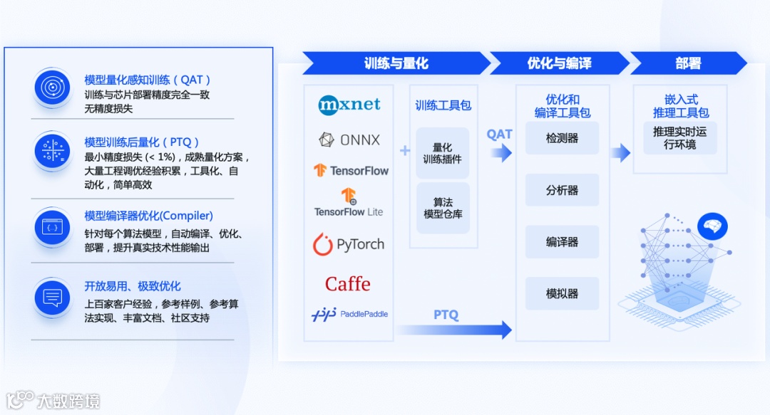 天工开物提供了算法开发全生命周期内所需的完善软件工具,能够满足模型量化、优化、编译、仿真、部署、调试等各个开发环节的需要。特别是在模型量化方面,提供量化感知训练(QAT)和训练后量化(PTQ)两类方式,可有效缩减模型大小,加速深度学习推理效率。同时,地平线在工具链基础之上,进一步提供了丰富的参考算法,全面满足开发者对计算性能与开发效率的要求与期待。