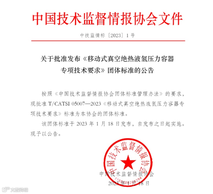 近日,中国技术监督情报协会正式发布T/CATSI 05007—2023《移动式真空绝热液氢压力容器专项技术要求》团体标准,该团体标准于2023年01月18日发布并实施。该标准由中国技术监督情报协会危化品储运装备技术与信息化工作委员会提出并归口,国富氢能参与起草。该标准规定了移动式真空绝热液氢压力容器的材料、设计、制造、检验与试验等方面的专项技术要求。生产单位在执行本文件时,应根据不同产品的技术条件制定企业标准,用于指导移动式真空绝热液氢压力容器的生产。