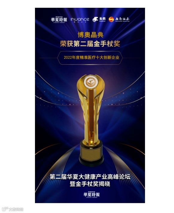 岁末年初,博奥晶典凭借在精准医疗领域的多项核心专利技术和高质量创新产品,在近日由华夏时报社、兰州新区管委会等单位共同主办的第二届华夏大健康产业高峰论坛暨金手杖奖颁奖盛典上喜获“2022年度精准医疗十大创新企业”。此次获得2022年度精准医疗十大创新企业,是对博奥晶典科技创新能力的充分肯定,亦是对博奥晶典行业龙头地位的高度认可。