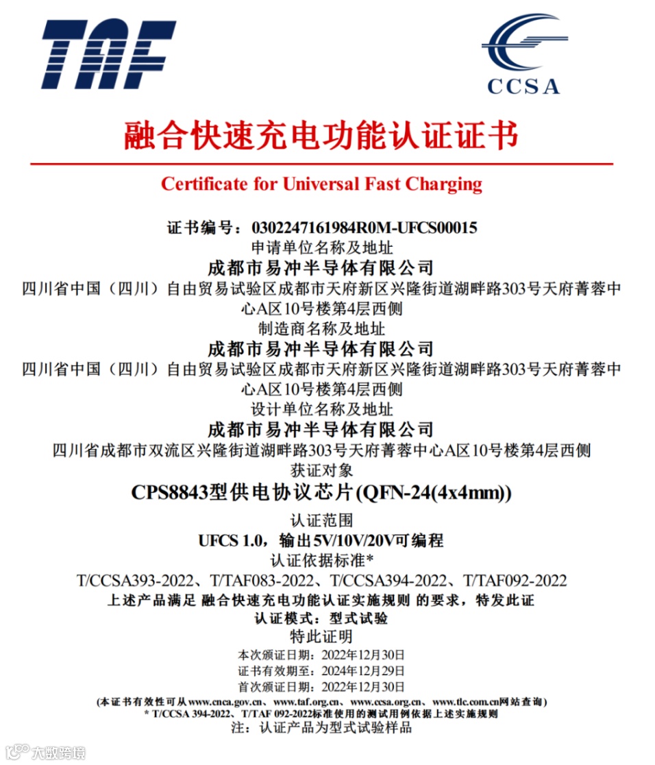 近日成都市易冲半导体有限公司旗下的 CPS8843 快充协议芯片成功通过了 UFCS 1.0在输出 5V/10V/20V ,最大电流3A(UFCS 60W)的可编程融合快速充电功能的认证,成功通过此项认证的协议芯片产品。