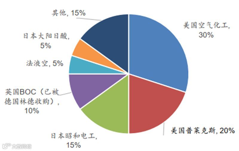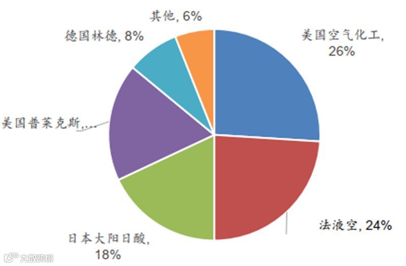 由于技术壁垒高、制备难度大,目前全球电子特气市场被几家海外龙头企业垄断。主要公司有美国空气化工产品公司、法国液化空气集团、日本大阳日酸株式会社、德国林德集团(2018年与美国普莱克斯公司合并)等,合计占据全球市场 94%的份额。中国的电子特气市场中,外资巨头也牢牢控制了 85%的市场份额,进口替代需求强烈。