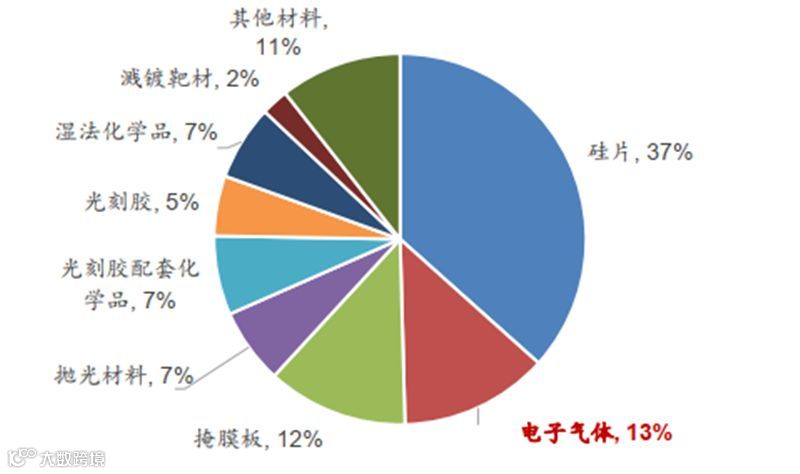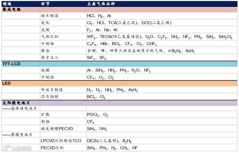 气体的产品种类丰富,电子元器件在其生产过程中对气体产品存在多样化需求。例如集成电路制造需经过硅片制造、氧化、光刻、气相沉积、蚀刻、离子注入等工艺环节,这个过程中需要的高纯特种气体和混合气体的种类超过 50 种,且每一种气体应用在特定的工艺步骤中。此外,在显示面板、LED、太阳能电池片等器件的制造中的不同工艺环节均会用到多种特种气体。