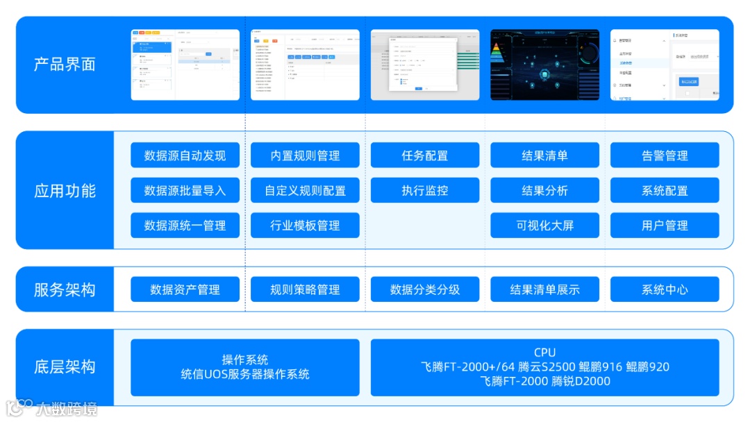 亿赛通数据安全分类分级系统建立在统信UOS操作系统及国产CPU基础之上,打造出纯国产化的数据分类分级系统,系统通过数据嗅探、自动上报、批量导入等方式梳理网络中的数据库、终端、文件服务、大数据及云数据,形成了多项领先优势: