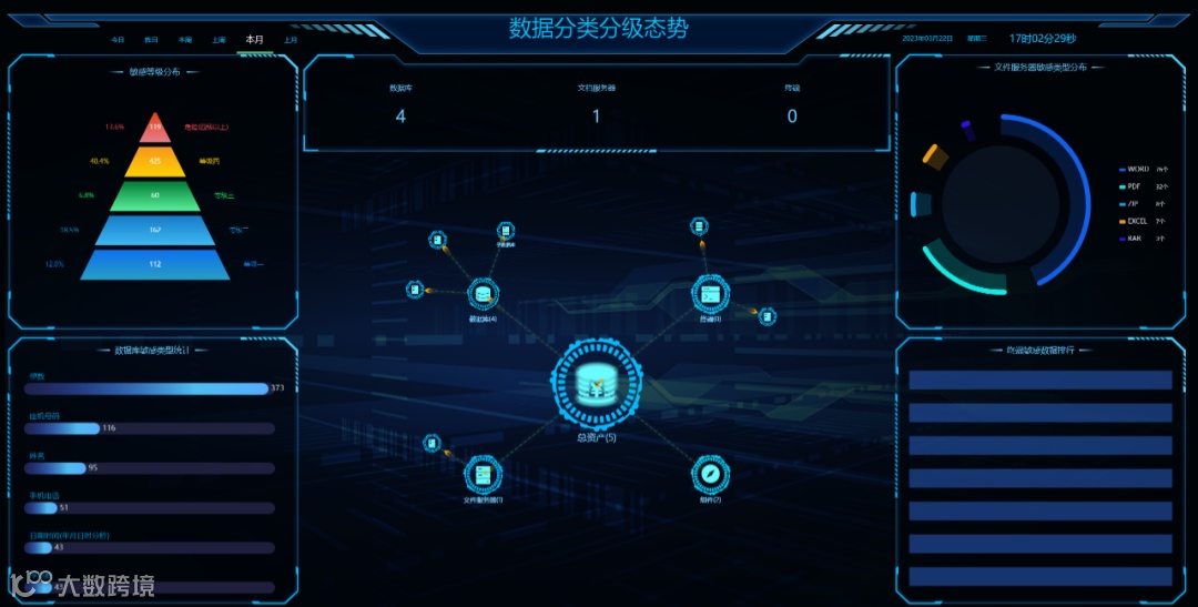 系统为数据安全提供资产可视化的直观呈现方式,例如统计分析当前系统梳理发现的数据库、数据表、字段、文件、敏感数据等,提高数据梳理效率。