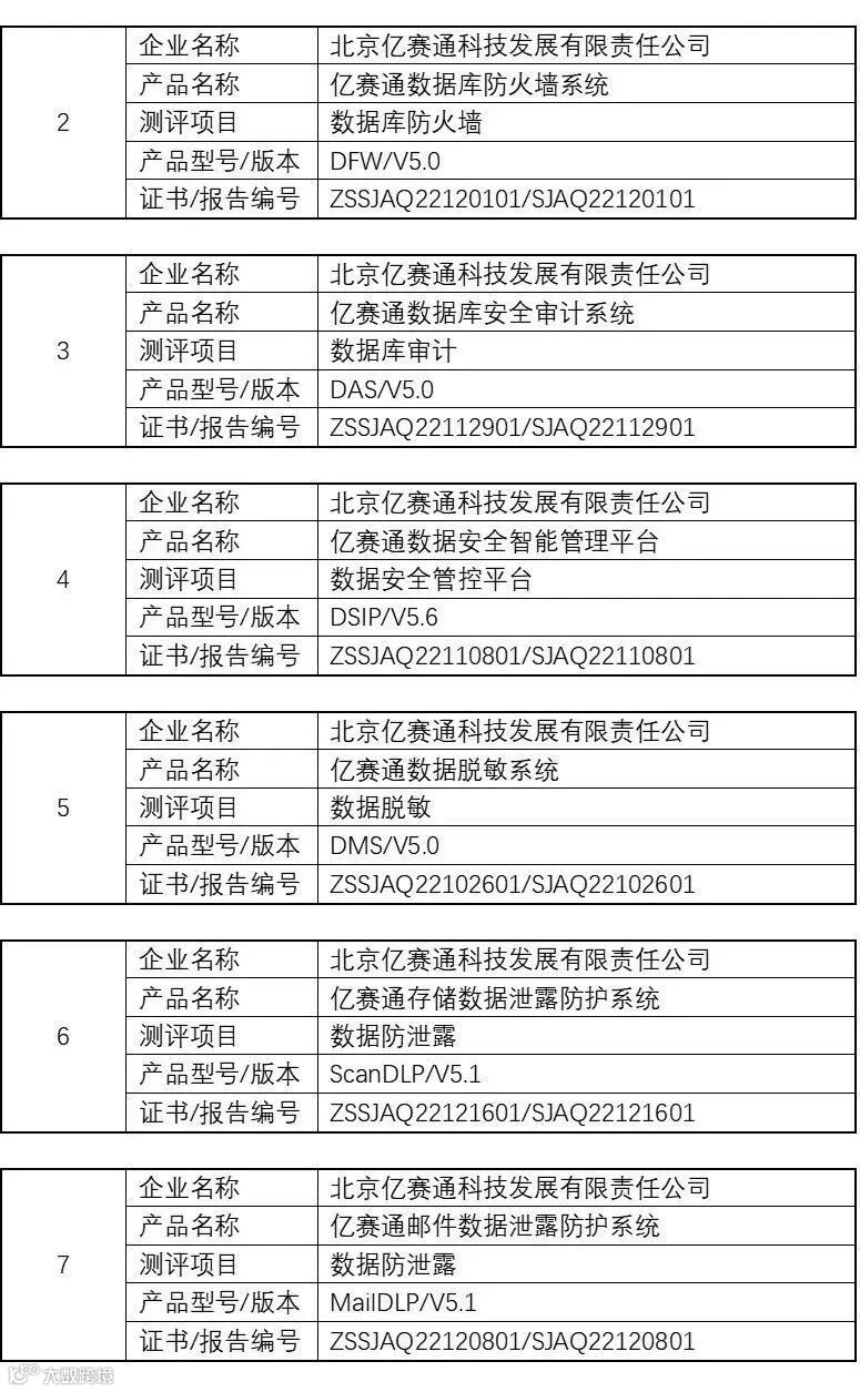 测评结果显示,亿赛通的“数据库安全审计系统(DAS)”、“数据库防火墙系统(DFW)”、“数据脱敏系统(DMS)”、“数据安全智能管理平台(DSIP)”、“存储数据泄露防护系统(存储DLP)”、“邮件数据泄露防护系统(邮件DLP)”等产品具备良好的综合技术能力和自身安全防护能力,支持了包含但不限于数据安全治理、脱敏、防火墙、邮件、存储设备端的数据泄露防护等各项能力,且性能较为稳定。
