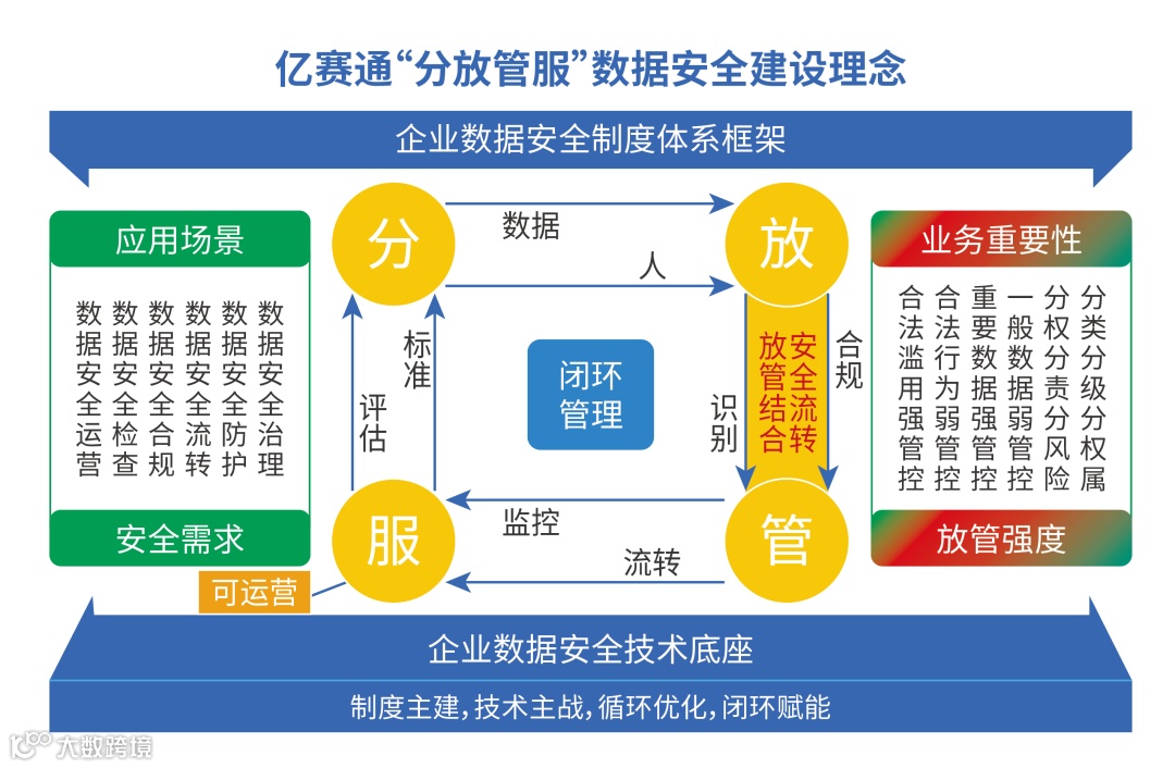 亿赛通遵循“分·放·管·服”数据安全建设理念,以“数据和人”为对象构建的数据治理、防护、流转、运营的双闭环体系,帮助企业形成扎实可靠的综合数据安全能力。