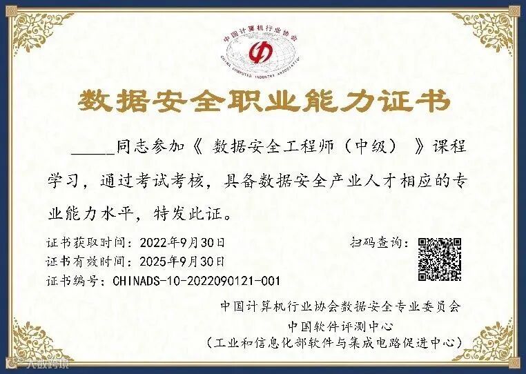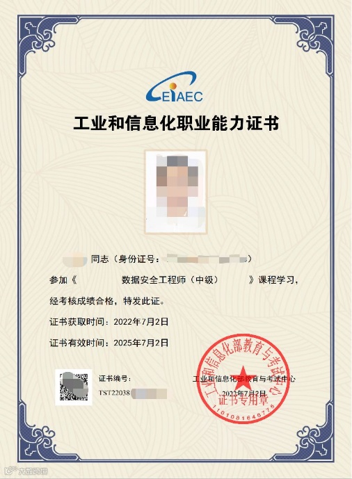 学员参与培训且考试合格后将同时获得工业和信息化部教育与考试中心颁发的“工业和信息化职业能力证书”和中国计算机行业协会数据安全专业委员会颁发的“数据安全职业能力证书”。证明学员在相应领域达到相应技术技能水平,且有助于企业参加项目投标活动。学员信息纳入 “工业和信息化技术技能人才数据库”,可在工业和信息化部教育与考试中心官网、工业和信息化技术技能人才网上学习平台、数据安全产业公共服务平台查询。