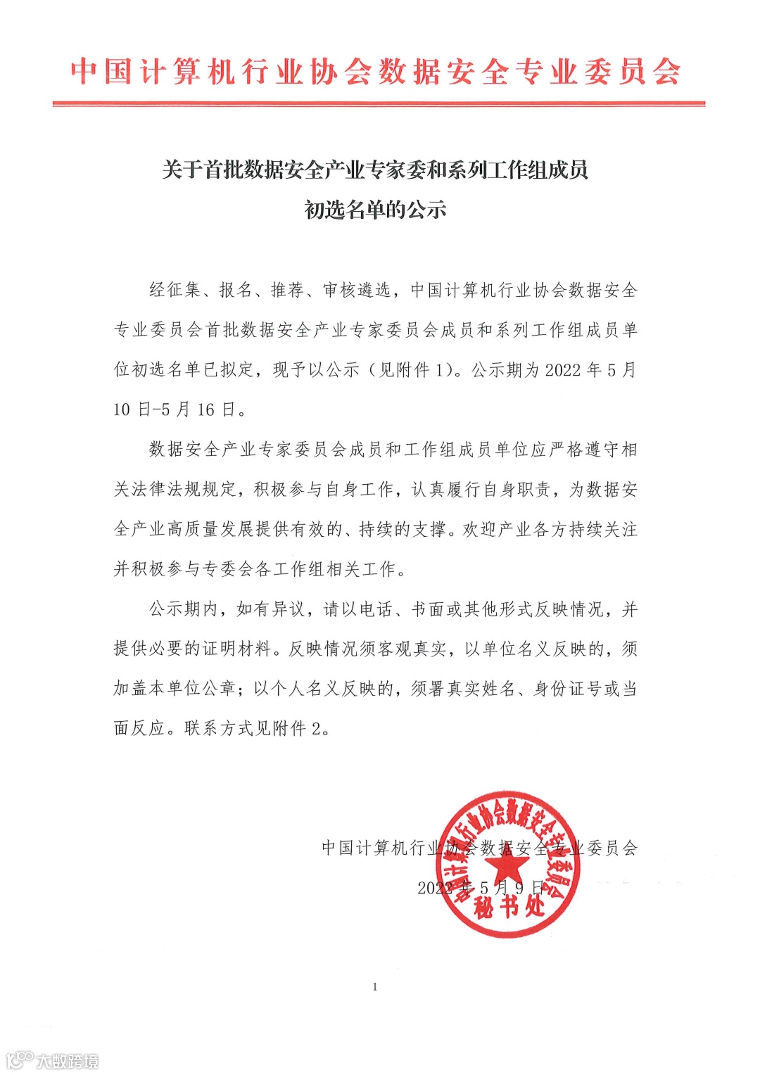 近日,由中国计算机行业协会数据安全专业委员会(以下称“数专委”)组建的数据安全产业专家委员会(以下称“专家委”)首批成员和系列工作组成员单位初选名单已面向社会进行公示。