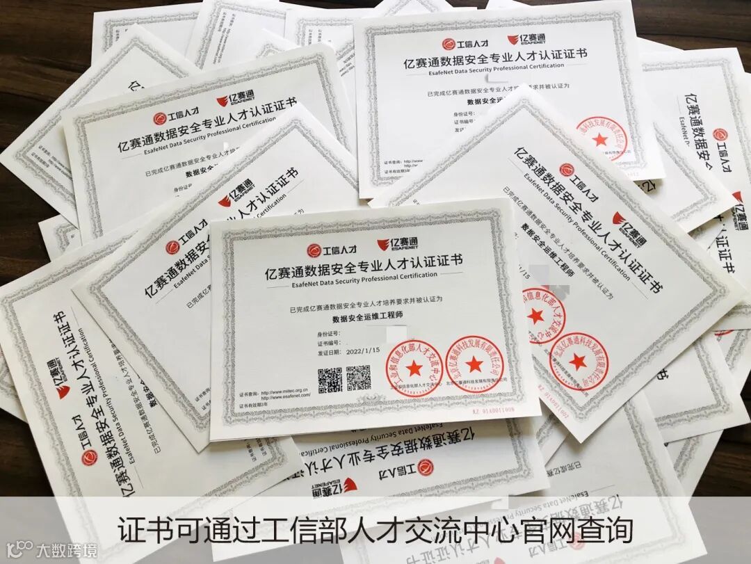 亿赛通深入学习贯彻党的十九大和十九届历次全会精神和中央人才工作会议精神,为加强数据安全领域人才队伍建设,促进我国数据安全人才培养,满足各行业对大数据安全技术、服务、产品的人才需求。亿赛通通过对自身研究成果与实践经验的提炼,总结成一整套标准化、高质量的培训体系及培训课程。课程现已经过工业和信息化部人才交流中心(以下简称:工信部人才交流中心)认证,双方就数据安全培训达成项目合作,共同培养数据安全人才。凡是通过亿赛通专业培训、考核的学员,将获得工信部人才交流中心与我司联合下发的“亿赛通数据安全专业人才认证证书”,为网络强国建设培养专业数据安全人才提供支撑!