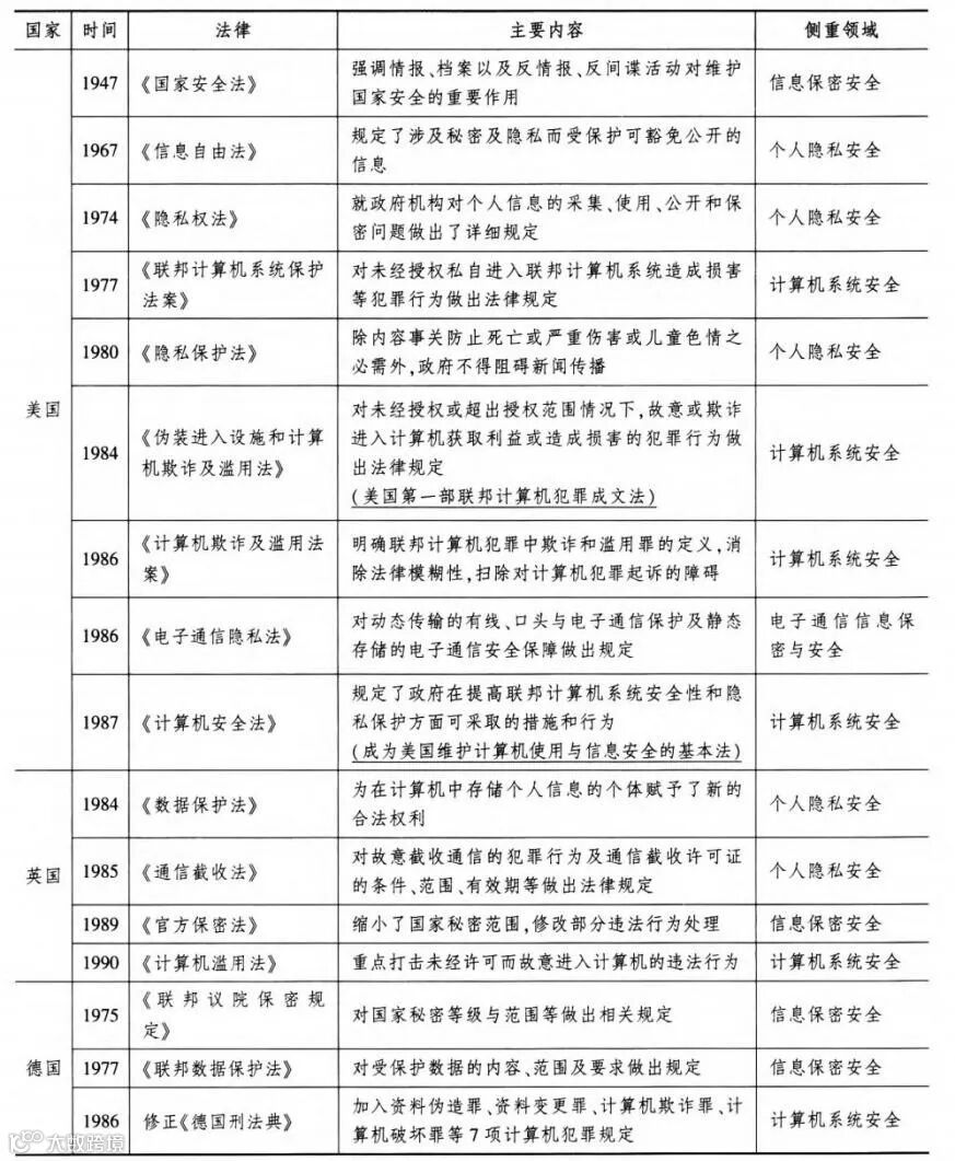英国针对日益严重的计算机犯罪,于1995年颁布《信息安全管理实施细则》,为各机构、组织的信息安全管理提供了一套相对完整的管理框架;1998年颁布《数据保护法案》,规定部分涉及国家安全、商业机密和个人隐私的信息受法律规范保护,可不对外公开。此外,英美两国还颁布了涉及信息基础设施、信息技术、国防安全、个人隐私的多部法律法规。