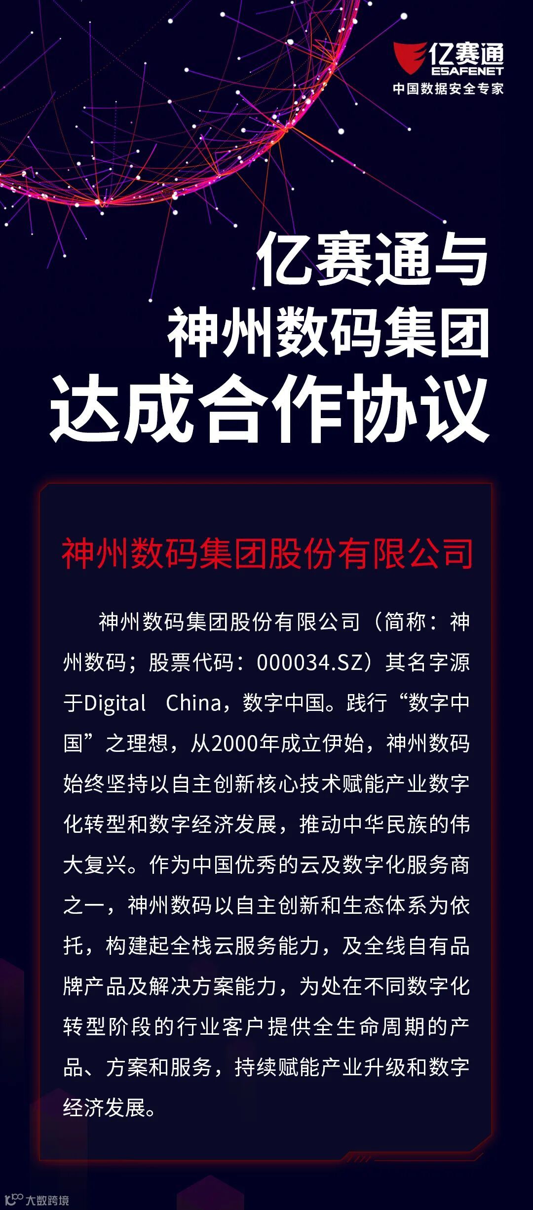 近期,亿赛通与神州数码集团正式达成合作协议。在产品技术、行业市场等方面成为生态伙伴,相互支持,共同发展。合作双方本着联合创新、协作共赢的原则,充分发挥自身优势,围绕安全领域展开紧密合作。