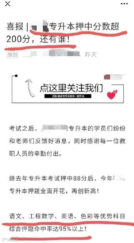 日前,山西当地一家名为某培训机构在其公众号上发文称,在今年专升本考试中押中原题超过200分。此文引发众多考生和网友愤怒,怀疑官方泄题。