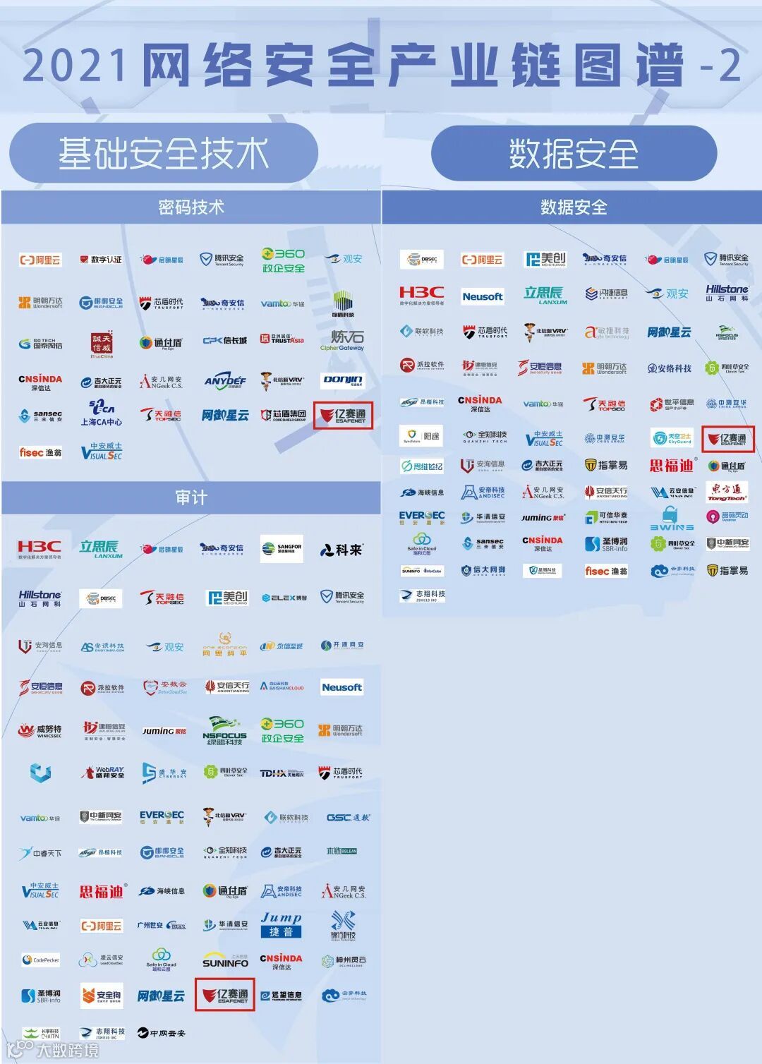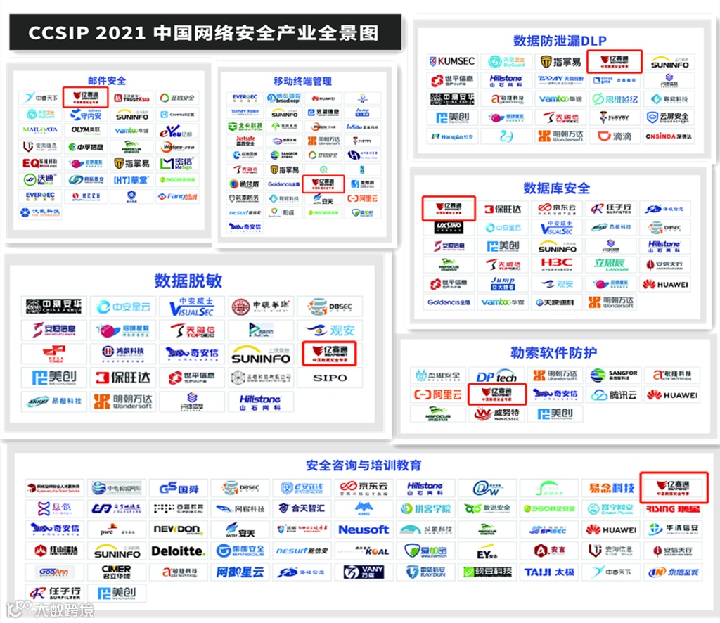 3月,在由安全牛发布的《第八版中国网络安全行业全景图》中,亿赛通“数据库安全、数据脱敏、数据防泄露、数据安全管控平台、文档安全、数据安全评估、邮件安全、视频监控安全、勒索软件防护”九大细分领域。