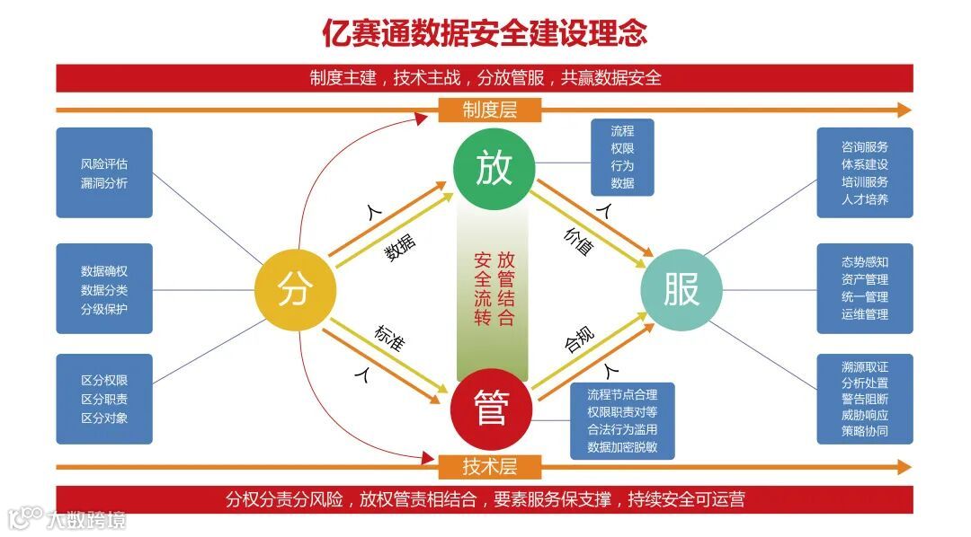 亿赛通作为专业数据安全厂商,具备结构化、半结构化及非结构化的数据全生命周期数据安全防护能力。针对数据安全的特殊性,我们以“分▪放▪管▪服”为数据安全建设理念,将用户数据实现分权分责分风险,放权管责相结合,做到要素服务保支撑,持续安全可运营,不断打造保护核心数据安全的精品,对国家重要基础数据以及个人隐私信息提供全套数据安全解决方案,为各级各部门提供专业的数据安全产品和技术服务。
