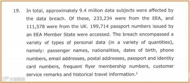 ICO称,2014年10月至2018年5月期间,国泰航空的计算机系统缺乏适当的安全措施,导致全球940万人的个人信息被泄露,其中111578人来自英国。被泄露乘客的个人信息包括:姓名、护照和身份信息、出生日期、电子邮件地址、电话号码和历史旅行信息等。