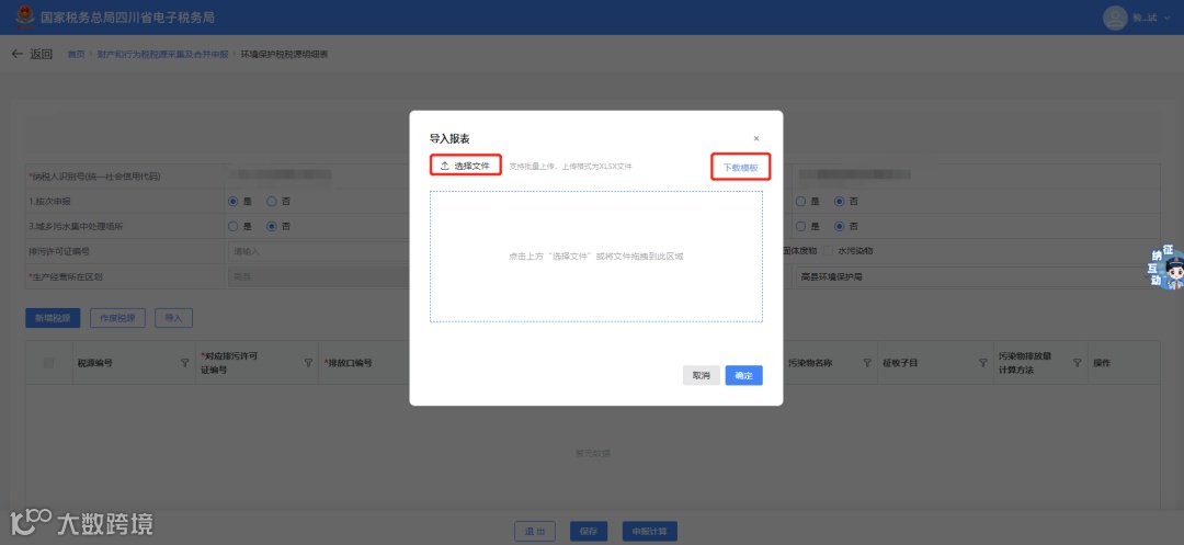 注:也可使用【导入】功能,可将需采集的税源信息批量进行导入。点击【导入】,在弹窗中选择【下载模板】,填写信息后点击【选择文件】或将文件直接拖拽至导入界面进行导入。