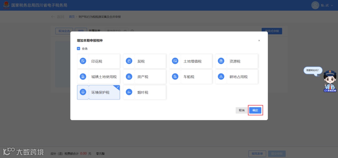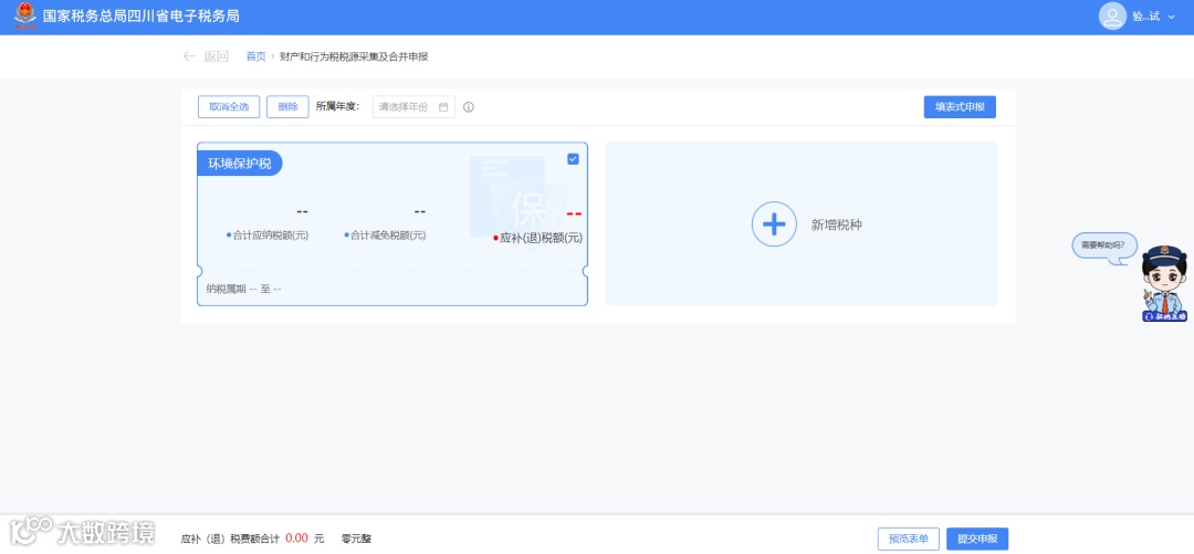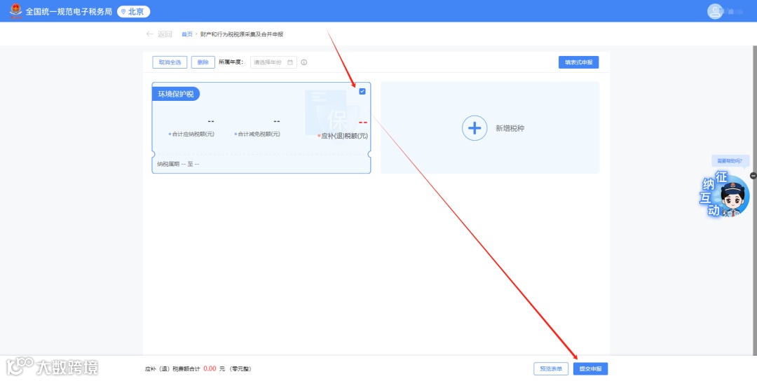 税源采集成功后,返回财产和行为税合并申报主页,点击勾选“环境保护税”卡片后点击【提交申报】即可申报成功。