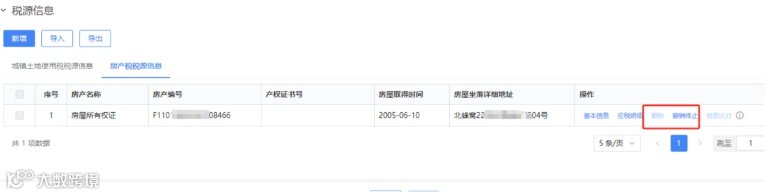 注:房源转出后操作下方显示“基本信息”、“应税明细”、“撤销终止”,“删除”和“信息比对”置灰。如下图。