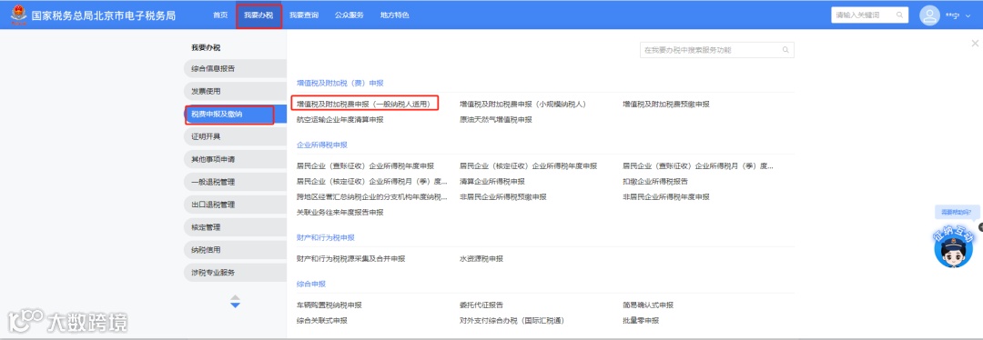 第一步:登录新版电局后,点击【我要办税】-【税费申报及缴纳】-【增值税及附加税费申报(一般纳税人适用)】进入申报模块;