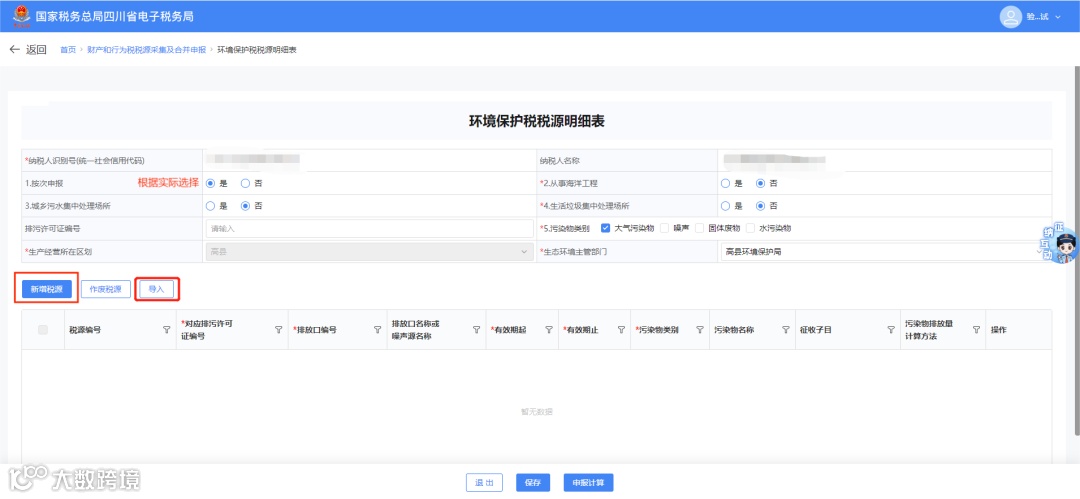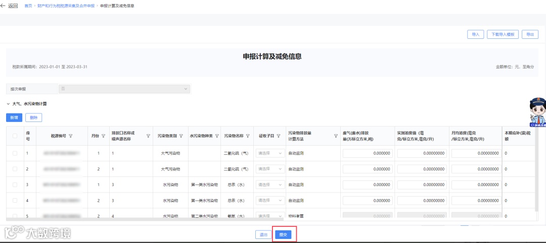 第三步:保存成功后返回环境保护税税源信息采集界面,点击【申报计算】,系统跳转申报计算及减免信息界面,输入详细信息进行税额计算。确认信息无误后点击【提交】,如下图所示: