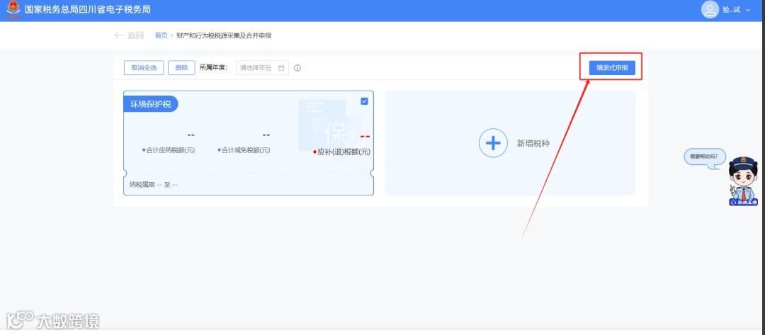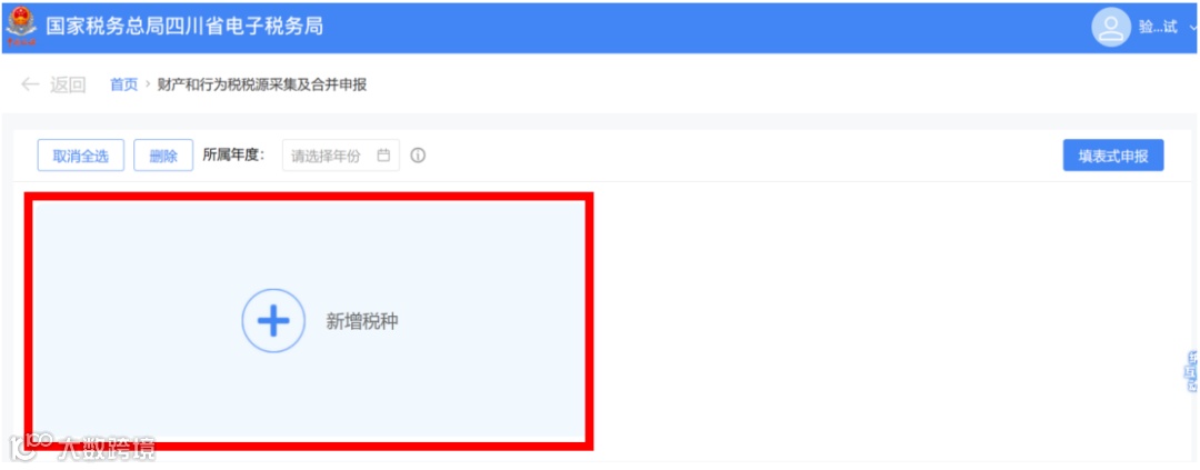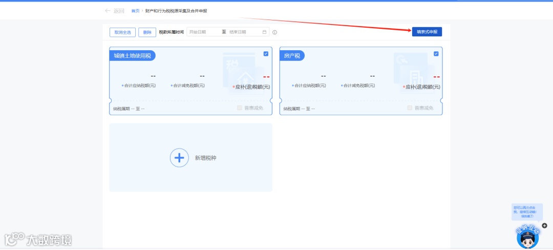 第一步:通过【我要办税】-【税费申报及缴纳】-【财产和行为税税源采集及合并申报】进入财行税申报模块,点击右上角【填表式申报】即可进入填表申报界面,