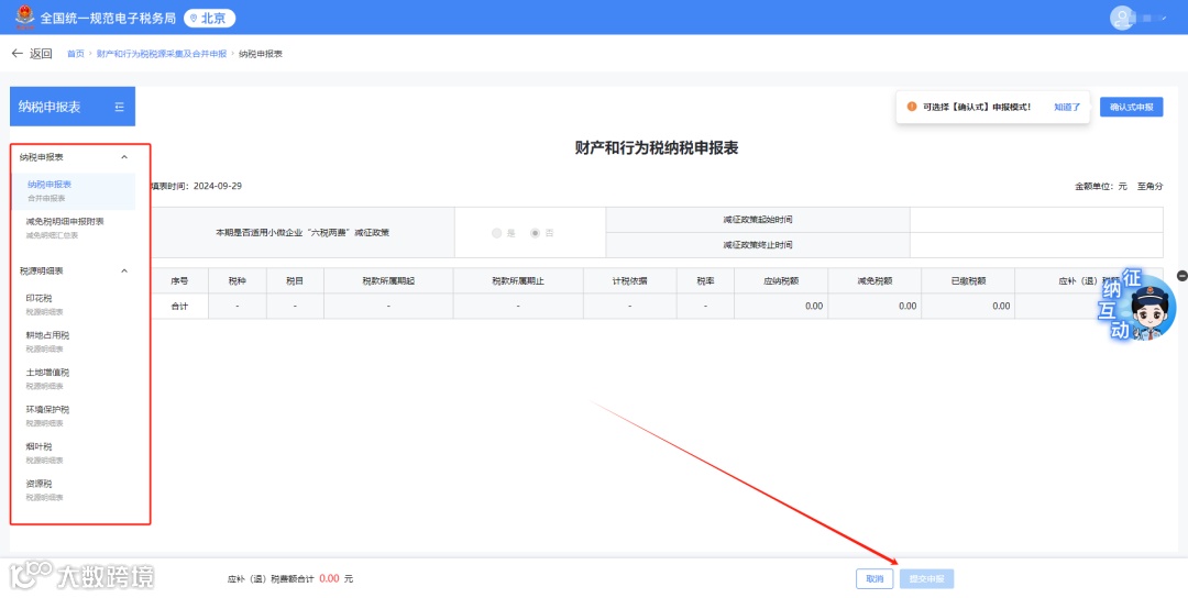 第三步:税源采集成功后应税信息自动带入《纳税申报表》(即合并申报主表),检查信息无误点击【提交申报】即可申报成功