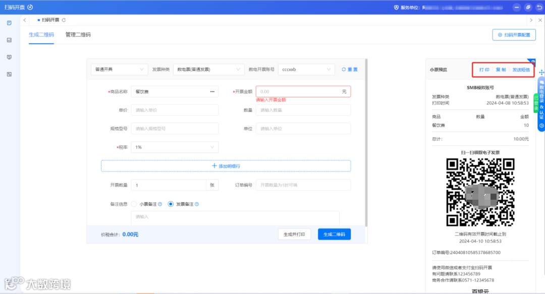 一、进入扫码开票界面,选择开具类型、发票种类、数电账号,选择已经添加好的商品名称,输入金额,商品税率会自动带出(其他字段为非必填项,如有需要可按需填写),填写完成后点击【生成二维码】