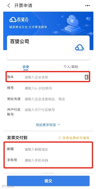 三、【消费者】使用微信或支付宝扫一扫二维码,弹出【开票申请】界面,填写公司名称后会自动带出税号等开票信息,维护好交付方式后点击【提交】按钮,提交成功后发票可自动开具