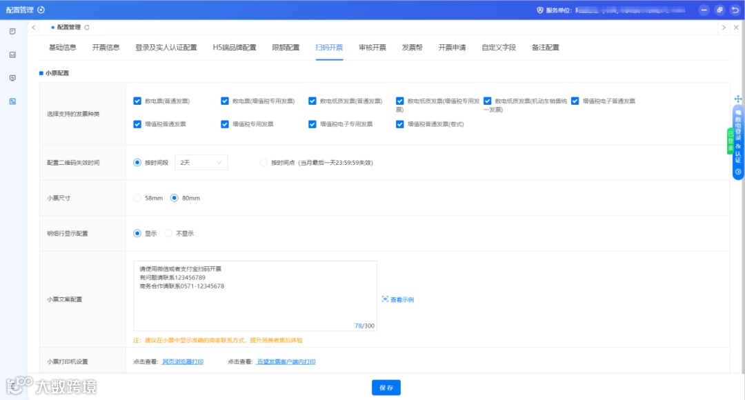 一、登录百望发票软件,点击【配置管理】-【扫码开票】,可在此配置小票信息(包含扫码开票所支持的发票种类,二维码失效时间,小票尺寸,明细行显示配置,小票文案配置等)
