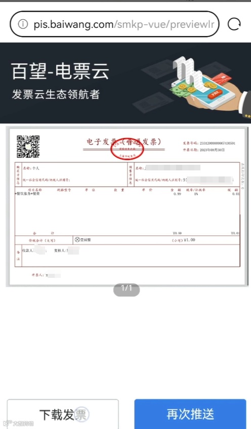 发票开具成功后,会推送至邮箱或短信中,消费者只需要点击发票链接就可以查看或下载发票
