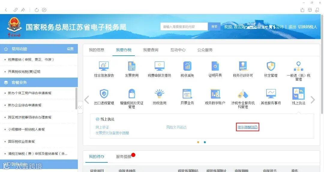 税务机关采取线上送达方式推送提示提醒函后,纳税人可登录国家税务总局江苏省电子税务局,首页下方“服务提醒”功能,即可查看推送的《纳税风险提醒函》,点击“查看”,提醒内容为:尊敬的***公司,现您有一条待办的提示提醒任务,请您通过风险管理类——提示提醒功能在规定时间内填写相关信息并上传附件资料。点击 “提示提醒函”,查看具体内容,可查看相关风险提示提醒信息、税收风险自查指引及风险自查反馈期限等。