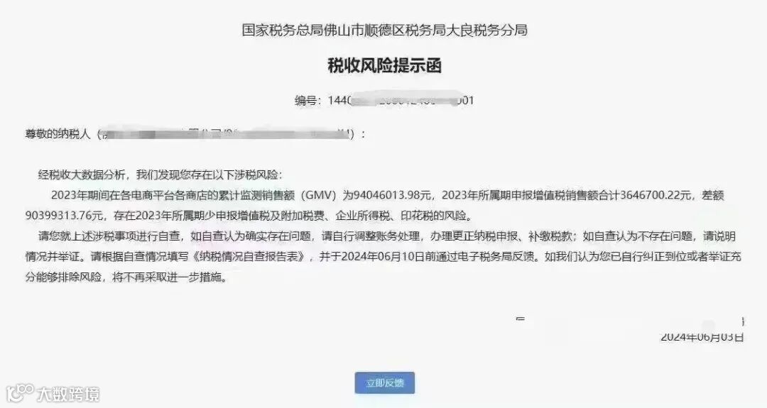 3.GMV与申报销售额相差近千万元,电商企业收到税收风险提示函