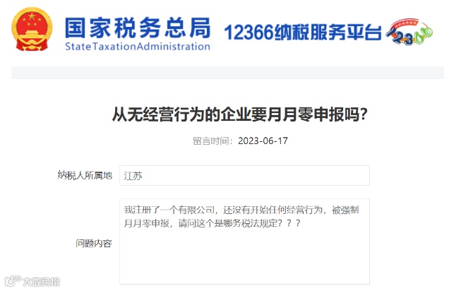 “从无经营行为的企业要月月零申报吗?”对此,税务局的回复是: