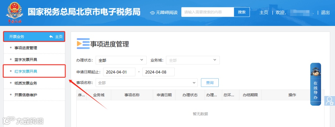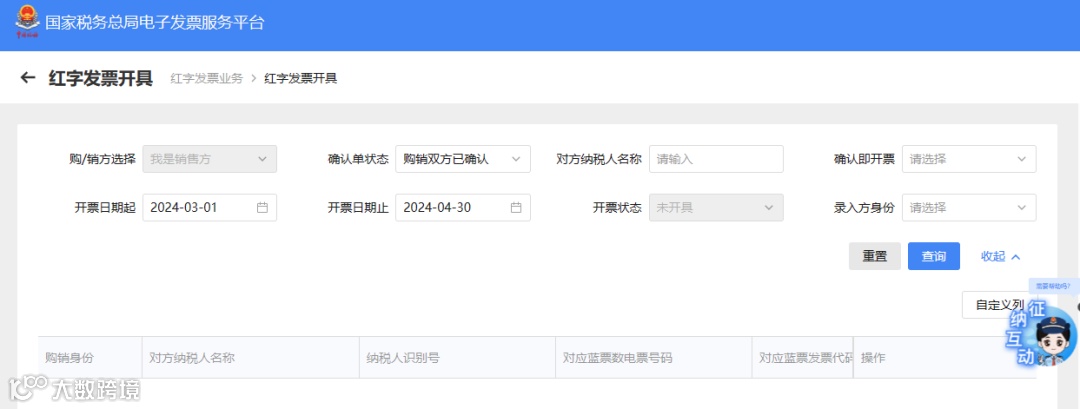 四、录入查询条件查询到此前开具的红字信息确认单,点击右侧的“去开票”,进入红字发票开具页面,之后正常开具红字发票即可。