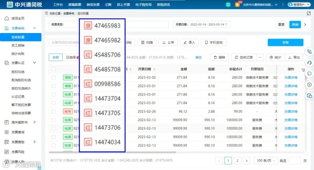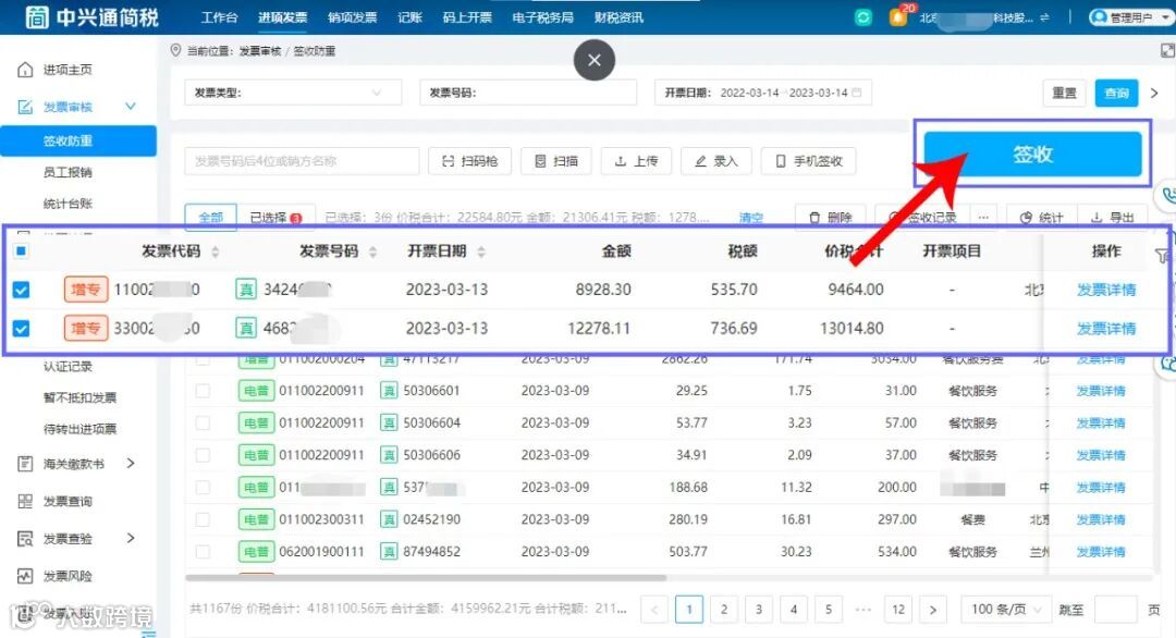 中兴通简税后台已经与好会计记账软件实现无缝连接,企业管理员仅通过【验收防重】一键签收发票,签收的原始数据就会自动同步到【记账】模块中。