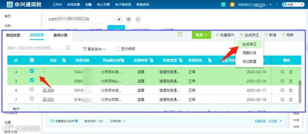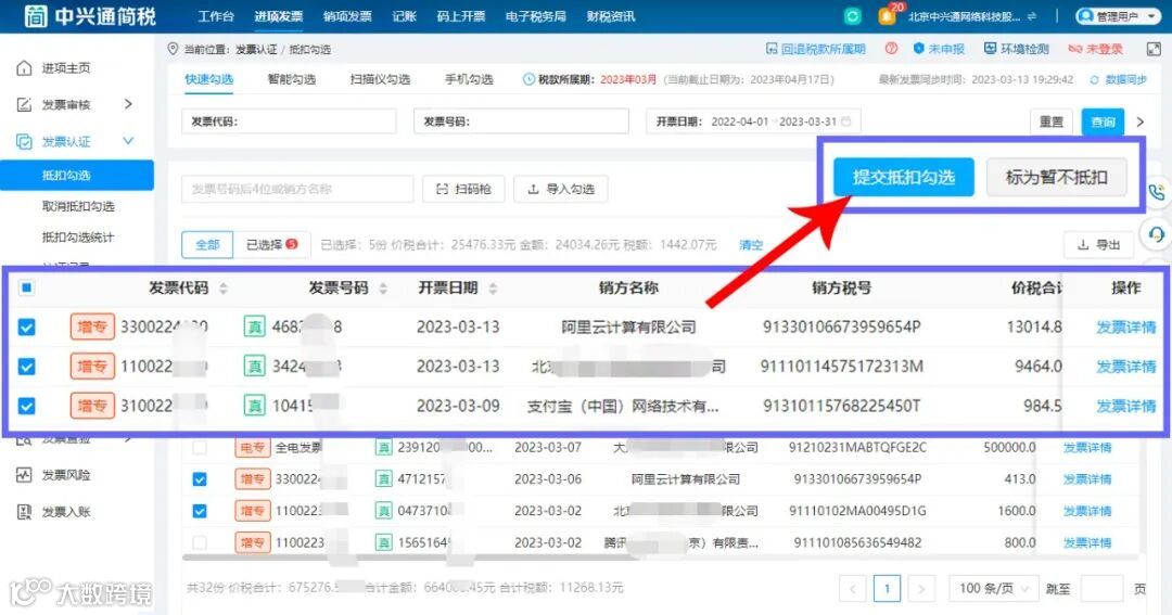 在中兴通简税【抵扣勾选】模块中,企业提交抵扣勾选发票后,相应的发票数据会自动同步至【记账】模块中。