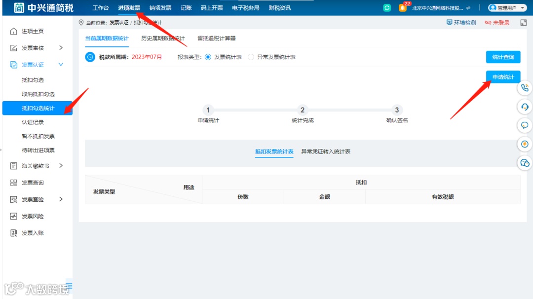 登录中兴简税,点击【进项勾选】—【发票认证】-【抵扣勾选统计】可查看当前税款所属期的统计状态及统计数据;点击【申请统计】即可提交官网进行数据统计。