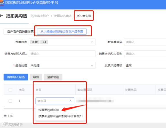 4) 确认是否为小规模纳税人开具的3%的农产品发票,如果是,则无法直接抵扣勾选,需要先依次点击【税务数字账户】-【发票勾选确认】-【抵扣类勾选】,进入“抵扣勾选”下“待处理农产品发票”界面,发票类型选择“从小规模处购进的3%农产品专票”对应的类型选择“按票面税额抵扣”,然后提交进行预处理,提交成功后通过抵扣勾选模块查询处理即可;