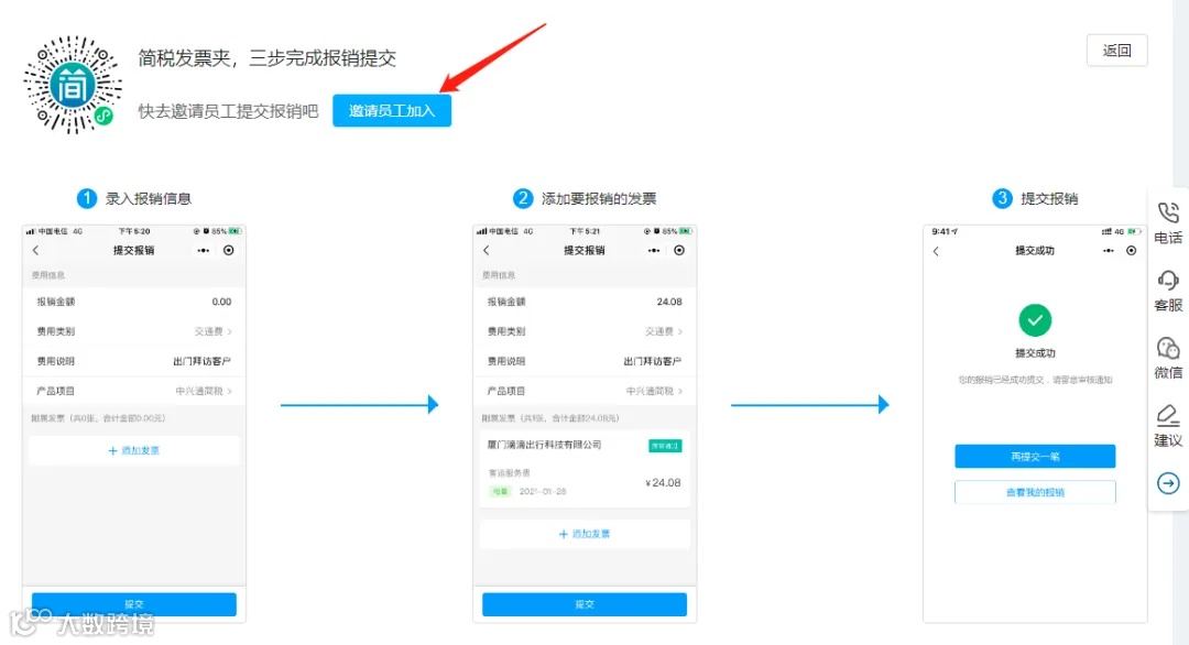 通过以下任一方式注册后,即可邀请员工,或让员工加入企业,使用简税发票夹进行手机报销。