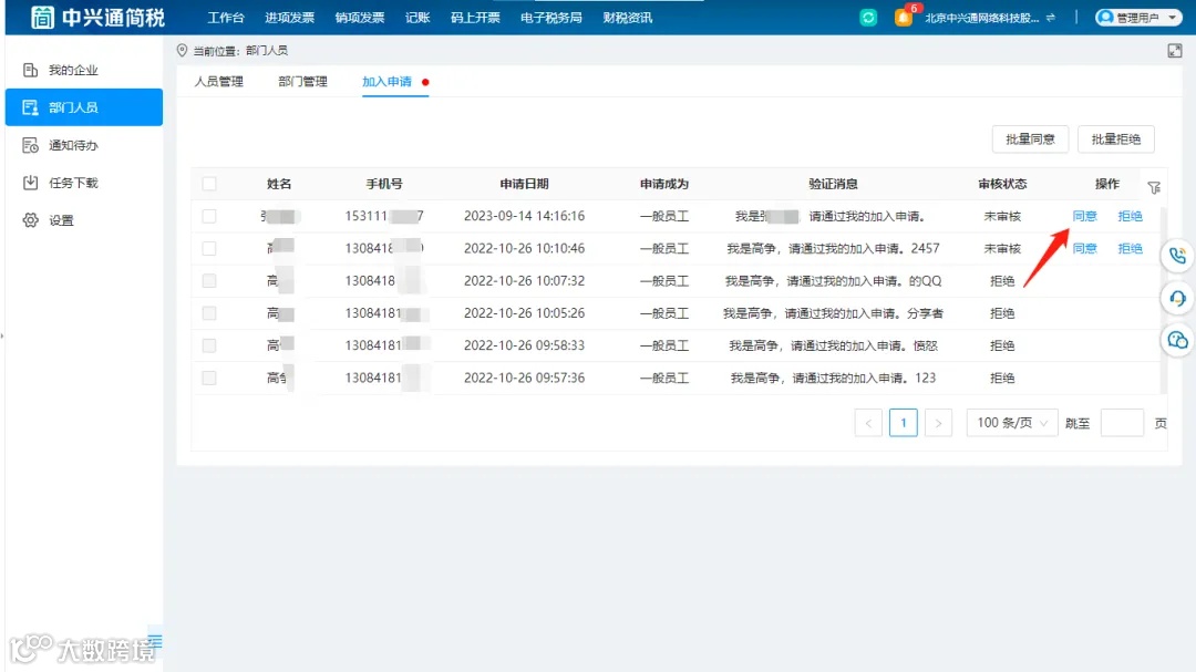 在部门人员的列表页,进入【加入申请】界面,选中对应的员工姓名,点击【确认】后,员工就可以使用简税发票夹了。