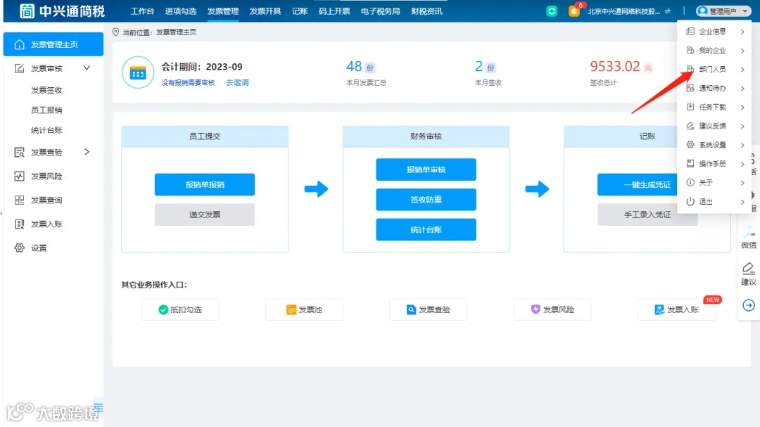 财务在中兴通简税首页,如下图,依次点击【管理用户】按钮,进入【部门人员】页面;